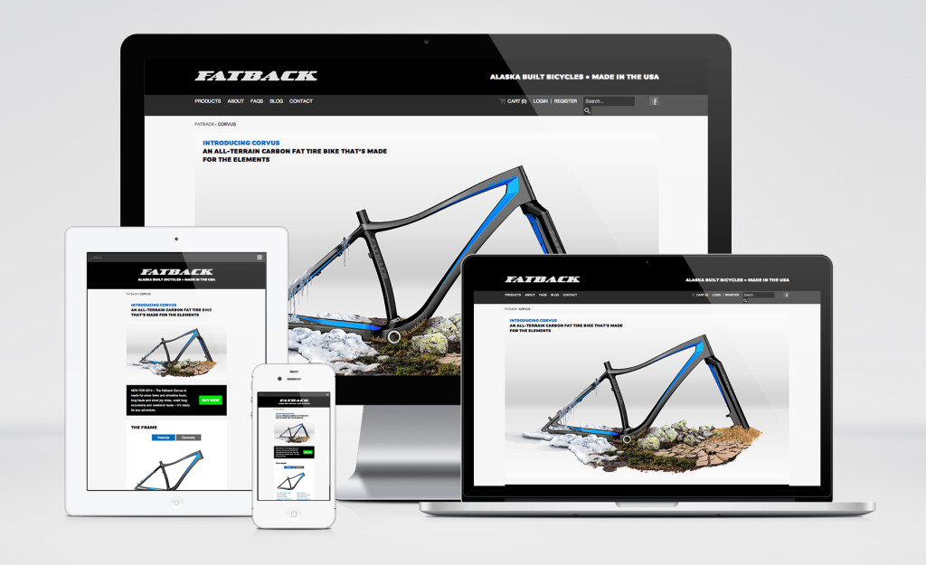 Speedway Cycles, a parent company of the Fatback brand, chose Humid Creative Agency to do a ground up redesign of the Fatback frame in carbon fiber. Josh Baker, owner and Industrial Designer, led a team of designers and myself in the completion of the graphics, press release package including a postcard, stickers and email and a branded landing page on Fatback’s website debuting Fatback’s newest model bike, Corvus.