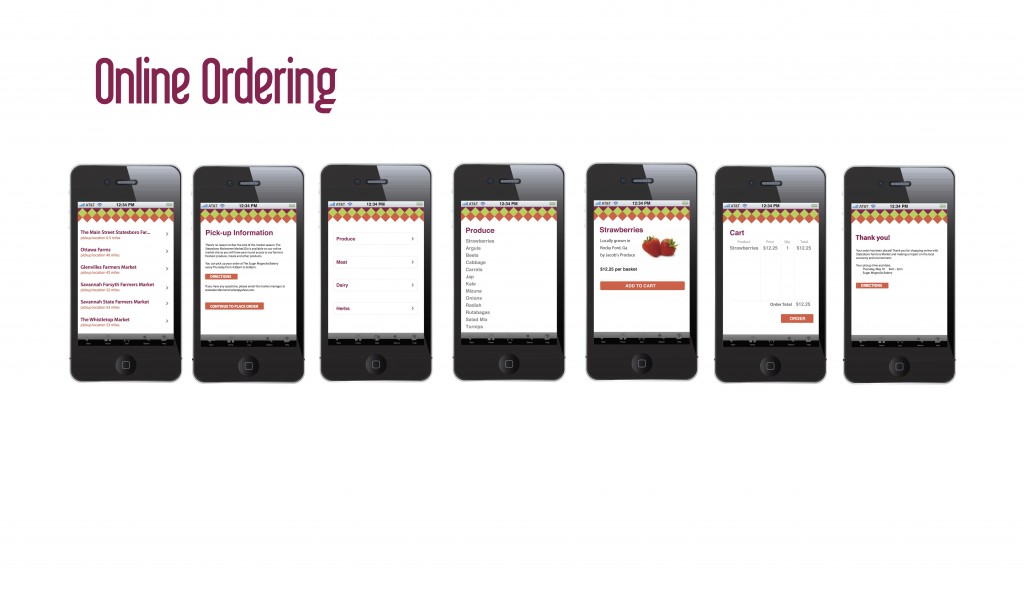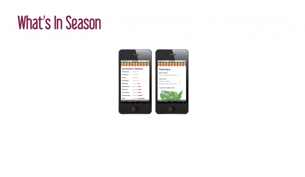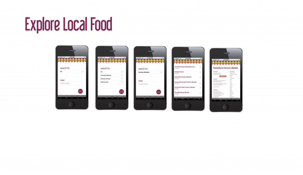 In collaboration with a team of designers we embarked on a city-wide effort to bring the community together through promoting locally grown food. By educating and spreading the word about how to access local foods we were able to shine some light on the ways to utilize your local food by season. We emphasized on the distance traveled “from farm to fork” between local and grocery store food and the many ways they can cook with their seasonal local foods. Our touch points included a Bi-Lo installation, a “education ambush” at the local mall and a smartphone app.